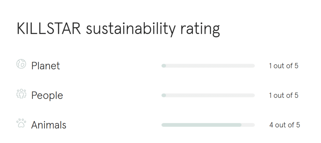In 2023, Good On You rated Killstar as ‘We Avoid’ – the lowest sustainability rating – for providing no evidence of lower-impact materials, following unsustainable fast-trend practices and not publishing sufficient information about their workers’ rights and waste produced by the company.